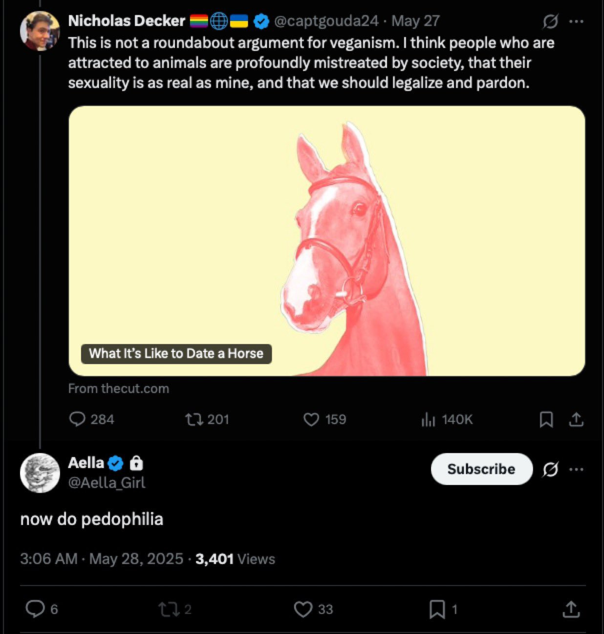 Then — what I am going to focus on here — there are the bizarre hypotheticals, debates about which will find their way into the far reaches of otherwise-unrelated Substack, Twitter, and beyond, baffling and grossing everyone out and causing waves of backlash to the mere act of asking the questions at all.
