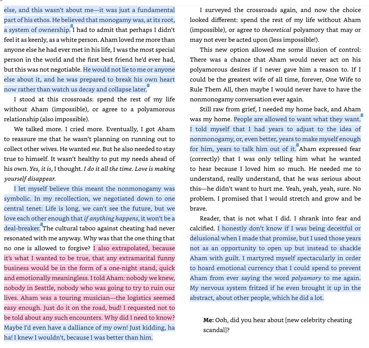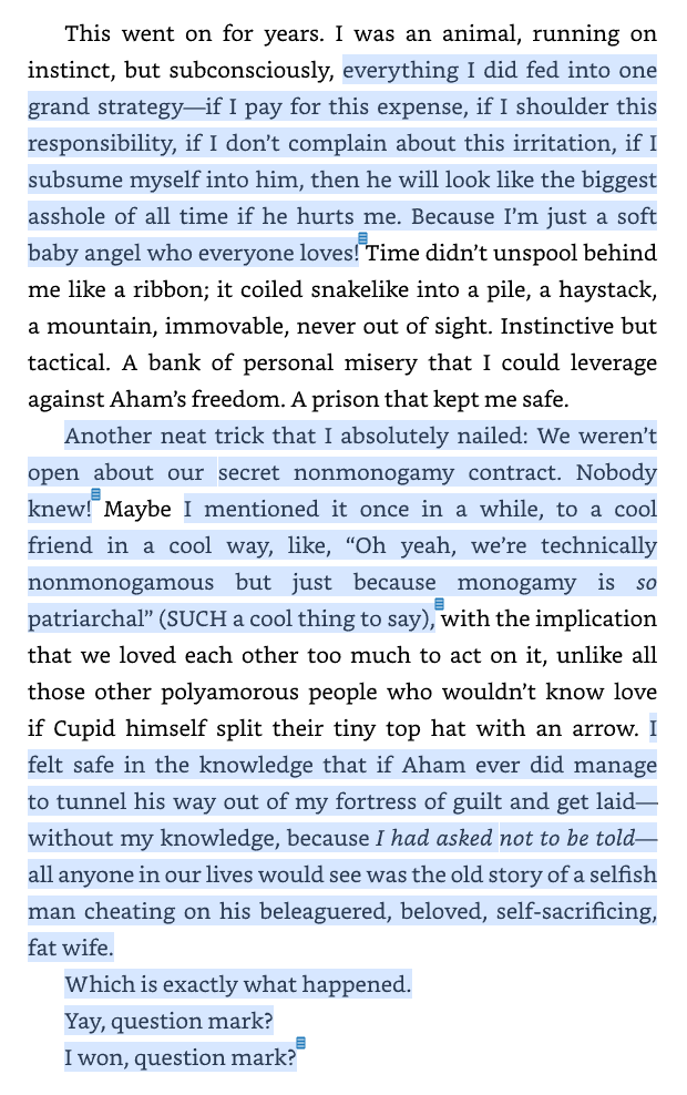 My ultimate verdict on this story is that it’s painfully clear that Lindy West’s self-esteem is in the toilet, and I don’t think she was trying to hide that. My unsolicited guess is that she probably agreed to this not because she felt any initial pull toward polyamory (or Roya), but because she conveniently stopped hating the idea6 and didn’t want to lose her husband, who was her most prized claim to the life she always wanted but always felt was out of reach; and also, sorry to say, her husband actually sounds a lot more honest than people are giving him credit for, although he also sounds like an immature, self-involved dork online. That said, I might, too, if my wife wrote a book explaining how she lied to me about what she wanted in our marriage and plotted for years to ruin my reputation, then the public made me out to be the asshole.