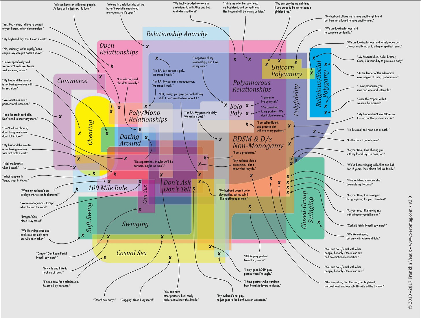 Another common misconception is that polyamory is when exclusive couples open up their relationships in some way or another, particularly after a long period of monogamy. Of course people do this, but it’s, again, not the way to be poly. Maybe the couple made this decision because someone was unfaithful and they thought this would heal the hurt that the betrayal caused, or prevent it from happening again, or because all their friends were doing it, or because they just read Sex at Dawn,3 or because they’re just bored and open-minded and want to see if it helps “keep the spark alive” or whatever.