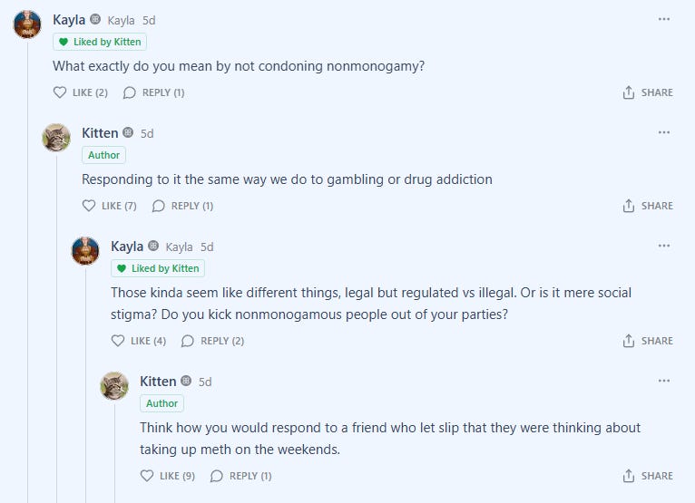 People who are committed to living this lifestyle publicly typically keep their dating lives to themselves, which I guess sounds contradictory, but really isn’t. They’re not going to hide it, but most who are hardcore into the lifestyle for more ethical reasons aren’t trying to convert normies. The ones everyone’s got an opinion about right now are the asshole men with the sad wives, but they’re conflating them with the poly commune folks and swinging couples who don’t care what anyone else does.