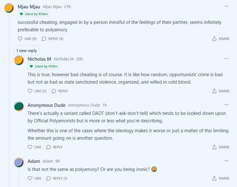 First, Mjau thinks active secret betrayal is better than honesty from the jump. Adam, however, thinks successful cheating and honesty from the jump are literally the same thing, implying that being “mindful of the feelings of their partner” can’t possibly include a mutual desire for this relationship style or the radical honesty it requires.