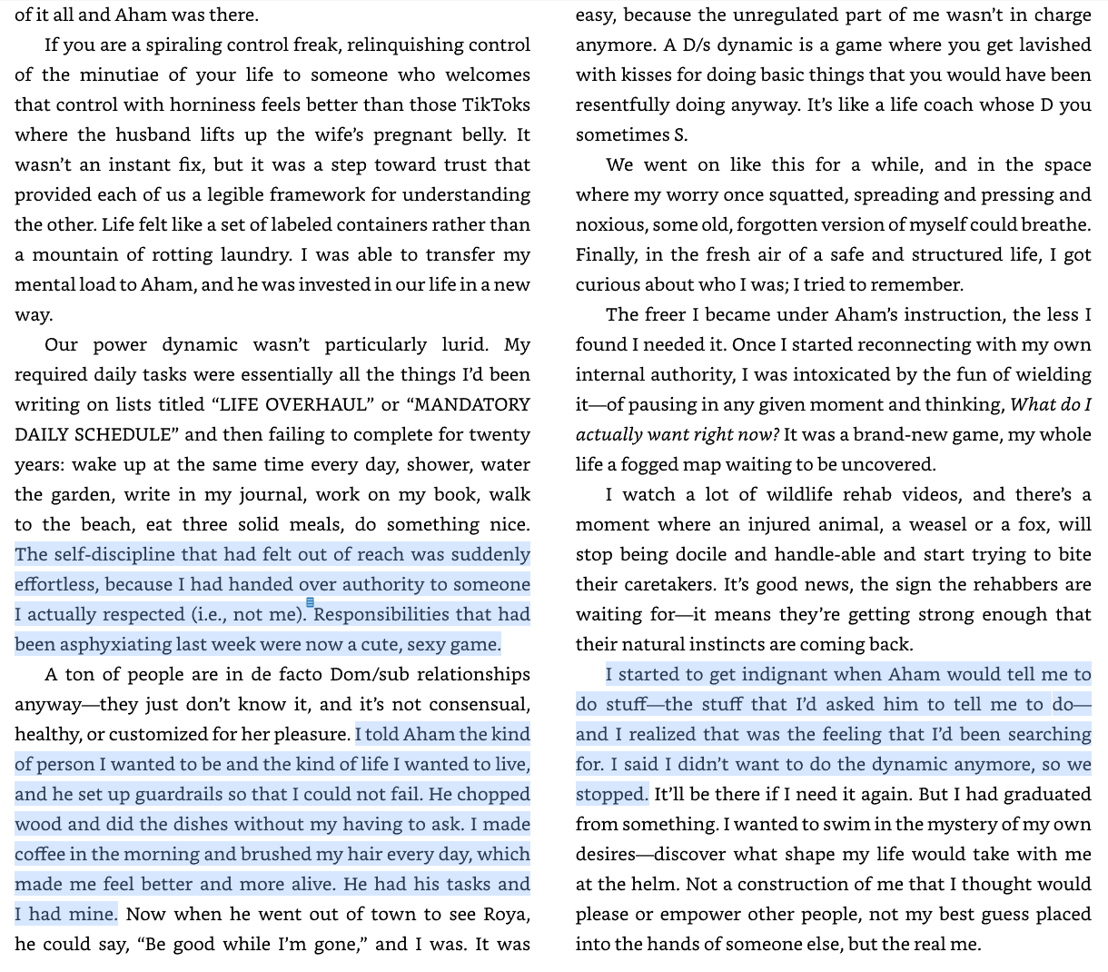 Our power dynamic wasn’t particularly lurid. My required daily tasks were essentially all the things I’d been writing on lists titled “LIFE OVERHAUL” or “MANDATORY DAILY SCHEDULE” and then failing to complete for twenty years: wake up at the same time every day, shower, water the garden, write in my journal, work on my book, walk to the beach, eat three solid meals, do something nice. The self-discipline that had felt out of reach was suddenly effortless, because I had handed over authority to someone I actually respected (i.e., not me). Responsibilities that had been asphyxiating last week were now a cute, sexy game.